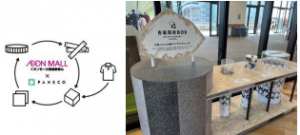 2階エキマエラウンジでは、不要になった衣料品を常時回収している。集まった衣料品は、PANECOとして新しく生まれ変わる。PANECOは、廃棄衣料品を原料とした循環型リサイクルボード。布製品であれば素材を選別せずに、原料にすることができる。