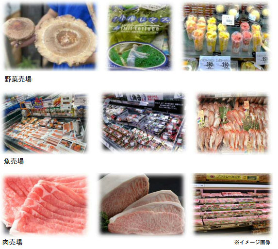 野菜売場では、産地直送コーナー「湯布院マルシェ」からは「湯布院いちご園」「由布のしいたけ」、「大在ファーム」や「コルディアーレ大分農園 」の野菜も展開する。魚売場では、元湯布院でミネラル豊富な湧き水で養殖された「九州サーモン」、「魚音」ブランドの「お魚屋さんのお鮨」からはりゅうきゅう丼・シラス丼などを品揃える。また毎週火曜日に大分県最大の「鶴見港」から直送した新鮮な生魚を届ける。肉売場では、美しい霜降りとやわらかさと美味しさが際立つ「おおいた和牛」や、きれいな空気とおいしい水で育った「うまみ和豚」、その他環境にやさしい「グリーンアイ純輝鶏」のノントレーパック商品などを品揃える。