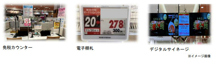 免税カウンターでは、訪日外国人のお客が同店で商品を購入した後、購入記録票の作成やパスポートチェックなどの免税手続き全てを一括して行い、消費税分を返金できるものだ。その他、商品の情報を分かりやすく提供する「電子棚札」を導入。また、デジタルディスプレイを使用して広告や情報を表示する「デジタルサイネージ」も導入する。