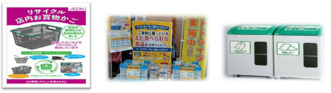 「環境への取り組み」としては破損や汚損で廃棄していたイオン店内用買い物かごをリサイクル原料として配合し、再び新しい買い物かごとして活用する「バスケット to バスケット」に取り組む。その他、フードドライブ活動やリサイクルボックスの設置、幸せの黄色いレシートキャンペーンなどにも取り組んでいく。