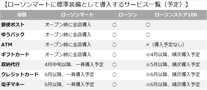 また、主力の従来型「ローソン」店舗とシステムを共有し、ATMや公共料金支払いなどのサービス機能を備えることで、食品スーパーマーケットに対する優位性を構築する戦略を採っている。ローソンマートに導入したサービスは、マーケットの状況に応じてローソンストア100にも順次導入する。