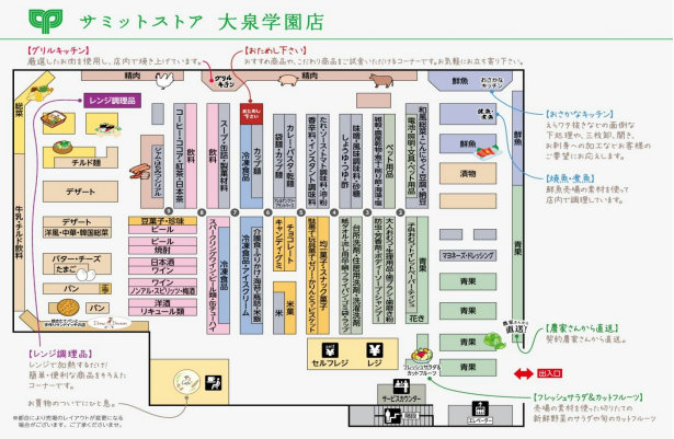大泉学園店のレイアウトは青果と惣菜・ベーカリーを両翼に配置した最近の改装パターンとなっている。