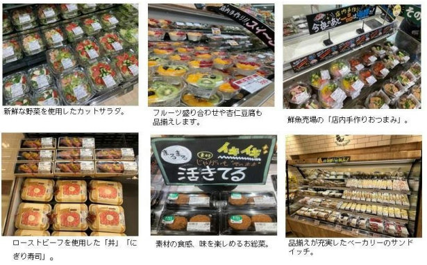 「フレッシュサラダ&カットフルーツ」コーナーは、季節の野菜を使ったサラダやフルーツ盛り合わせを新設した専用の作業場から提供する。総菜売場では、「ローストビーフ」を使った丼や鮮魚の「お刺身」を使ったお寿司を販売。ベーカリー売場では、「サンドイッチ類」や「冷蔵スイーツ」、出来立て商品を提供していく。