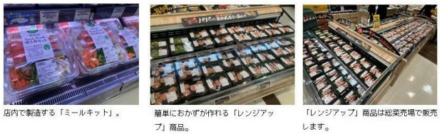 鮮魚・精肉売場では、フライパン一つで簡単におかずが作れる「ミールキット」を導入。また、需要が高い「レンジアップ商品」は、品揃えを拡大し、総菜売場でまとめて提供する。