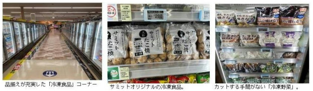 冷凍食品売場では、棚付きの什器を入れ、品揃えを約2倍に増加。「冷凍野菜・果物」「冷凍スイーツ」や弁当のおかずになる商品の品揃えを充実させた。