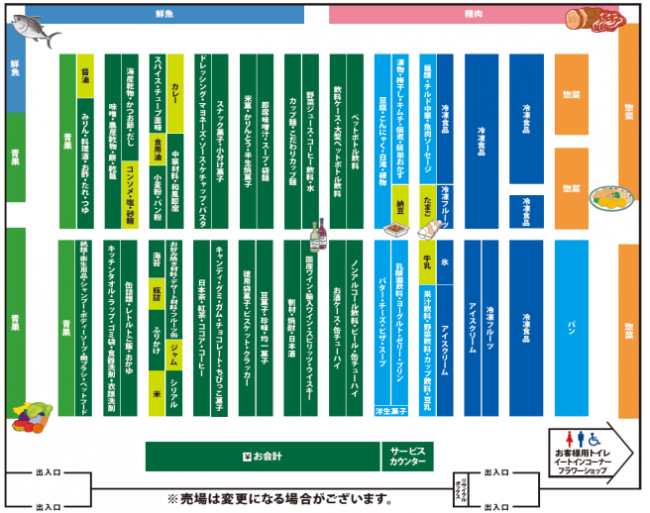 TAIRAYA小川店の売場は、時計回りで青果、鮮魚、精肉、惣菜によってコの字で囲むレイアウトとしている。動線では最終コーナーにあたる惣菜売場と冷食売場、パン売場を近接させていて即食性と簡便性を強調している。