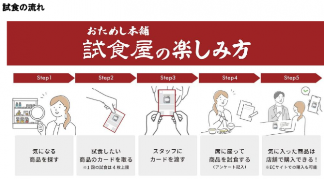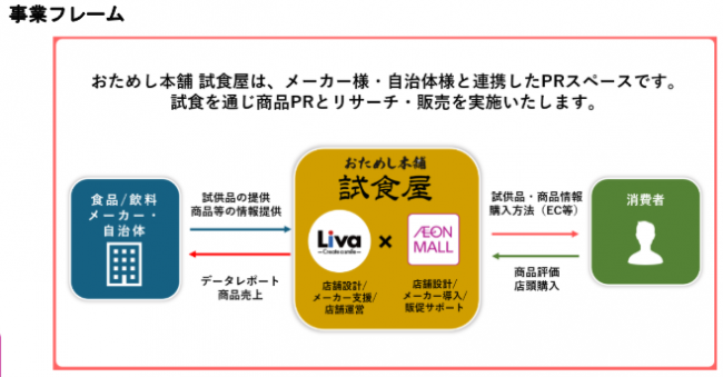 食品・飲料のマーケティング支援サービスを行う(株)Liva(東京都目黒区、中村圭吾社長)との協業で行う。試食屋では試食商品の感想を収集し、メーカー・自治体へフィードバックすることで、今後の商品開発に活用する。