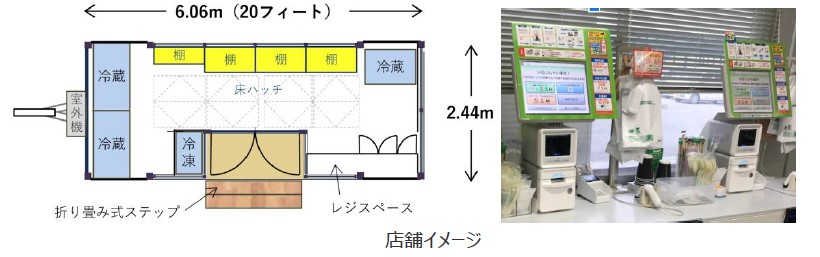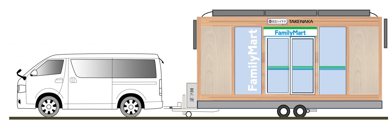 移動型無人トレーラー店舗は、竹中工務店と日立ハイテクの移動可能な工事事務所「牽引式オフグリッド型モバイルハウス」を発展させた、開放感と機能性を確保した設計の店舗。また店舗には日立ハイテクのソーラーパネルと蓄電池、制御機器などの自立電源システムと衛星インターネットが搭載されていて、自立通信が可能となっている。ソーラーパネルで発電した電気は蓄電池に充電され、トレーラー店舗内の空調設備などに必要な電気を供給するため、安定した電力供給と通信機能が提供される。