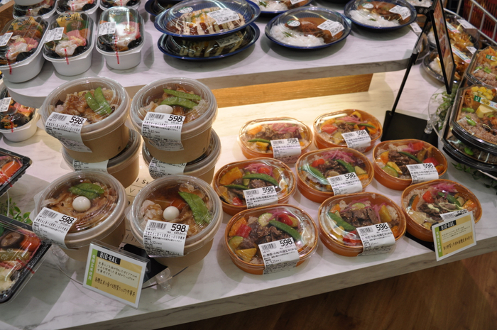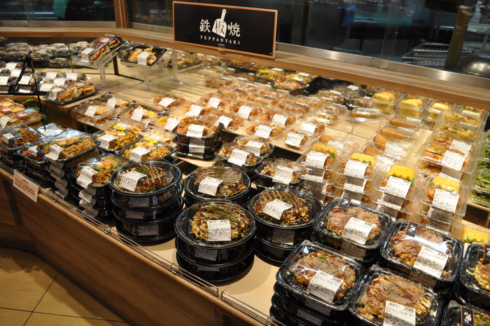 惣菜売場では、鉄板焼きコーナーを設けて「自社製鉄板だし巻き玉子」が入ったおかずセットや、お好み焼きを提供する。また国産コシヒカリ・有明産海苔・淡路島藻塩を使用した「手作りおにぎり」や、素材や添加物に配慮した「ビオラル弁当」を用意する。