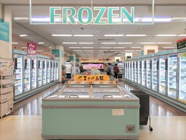冷凍食品では、保存に便利なペット用の冷凍食品まで、約1200品目以上を取り揃えます。フローズンスイーツコーナ ーを新規で展開する。惣菜売場は新規品揃えとして、地元大田産あなごを使用した穴子天重、寿司コーナーでは、地元郷土料理寿司の角寿司を展開する。