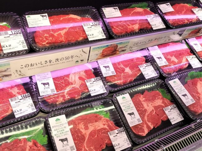 精肉売場では、隠岐牛や石見ポークなどの地元ブランド肉を新規に品揃えするまた、子育てファミリー向けに豚肉や鶏肉のジャンボパックの コーナーや、トップバリュ グリーンアイナチュラル「タスマニアビーフ」のステーキコーナ ーを常設展開するほか、すべて4等級以上でイオンが厳しく選定し、国内指定農場で育った黒毛和牛「トップバリュ 匠和牛」の希少部位をコーナー化する。