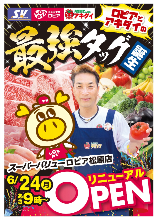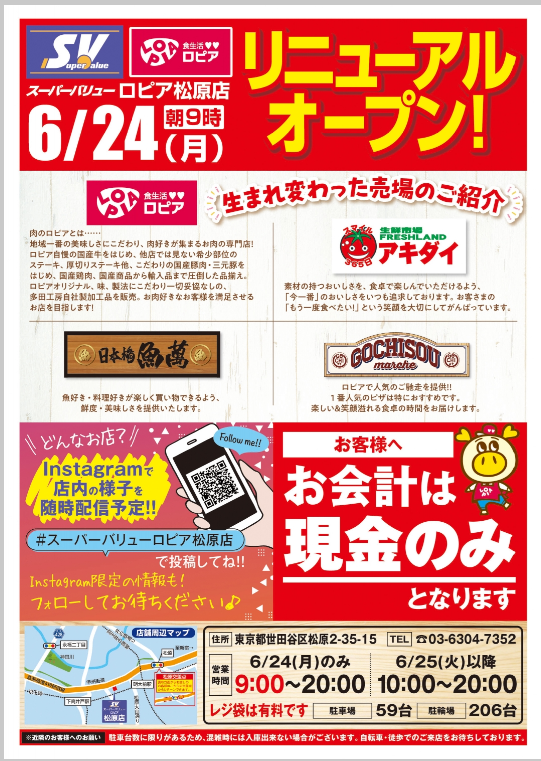 流通スーパーニュース > 店舗 > スーパーバリューnews|松原店を「スーパーバリューロピア」に6/24刷新 スーパーバリューnews|松原店を「スーパーバリューロピア」に6/24刷新 店舗 / 2024年06月17日 ツイート (株)スーパーバリュー(埼玉県上尾市、内田貴之社長)は6月24日(月)、世田谷区にあるスーパーバリュー店舗を「スーパーバリューロピア松原店」に改装してオープンする。 食品売場はロピアに加え、OICグループの傘下のアキダイが青果を担当する。 ■スーパーバリューロピア松原店 所在地/東京都世田谷区松原2-35-15MAP 営業時間/10:00~20:00 駐車場/59台 支払い方法/現金のみ ツイート