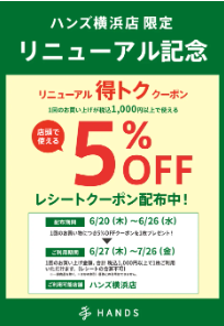 さらに、6月20日(木)~6月26日(水)の期間、ハンズ横浜店で商品を購入した顧客に5%OFFクーポンを配布する。6月27日(木)~7月26日(金)の期間、1回の購入金額1000円以上で1枚利用できる。