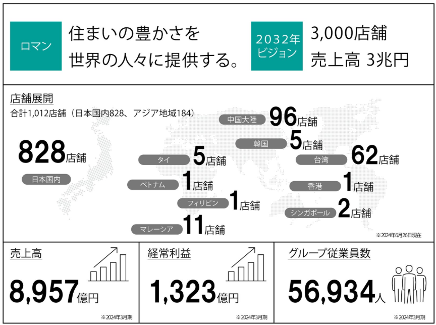 ニトリグループは「住まいの豊かさを世界の⼈々に提供する。」というロマンを掲げ、2032年までに3000店舗・売上⾼3兆円を目指している。家具、ホームファッション関連商品を取り扱う「ニトリ」、⽣活必需品を中⼼に⼈気の⾼いホームファッション商品を取り扱う「デコホーム」、エクステリア商品も取り扱うホームセンター「島忠」、⼤⼈の⼥性向けアパレルブランドを取り扱う「N プラス」等、幅広い事業を展開している。