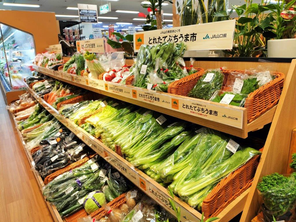 野菜・果物売場では、防府市近郊や山口市徳地地区で栽培・出荷された農産物を中心とした産直コーナーを拡大する。またトマト売場を拡大し、「山口市秋穂トマト」や「下関市垢田トマト」などを取り揃える。果物売場では、山口県萩市の「相島すいか」や、秋には美祢市の「秋芳梨」などの山口県産果実に加え、福岡県産のぶどうや桃、秋には熊本産の梨など、九州産の旬の果実も展開する。