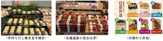 惣菜売場では、「日高昆布だし」を使用し、だし感や風味にこだわったオリジナルの「手作りだし巻き玉子焼き」を販売する。さらに、「ローストビーフ」を使用した「サラダ」や「ローストビーフ丼」、「生春巻き」を揃える。米飯では「日替わり弁当」で飽きさせない品揃えをする。