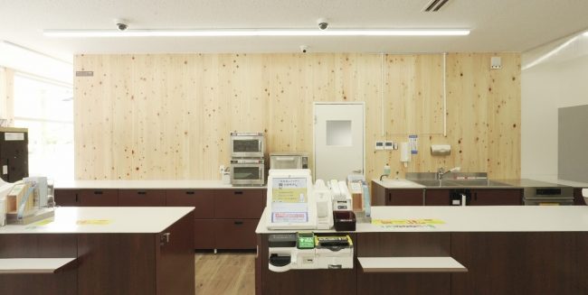 店舗は、建物の躯体、内外装に福岡市産木材を主とした国産木材を活用した木造店舗。従来の標準工法(軽量鉄骨工法)と比較すると、店舗の建築および解体などにおけるCO2排出量の削減効果は約15%を見込んでいる。