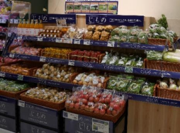 「じもの」商品では地域の生産者との協力による地場野菜や地域の銘産品などを集めた「じもの」コーナーを充実させた。地元漁港の魚介、県内産の豚肉、地元工場による生産加工品など地元商品を多数品揃えする。