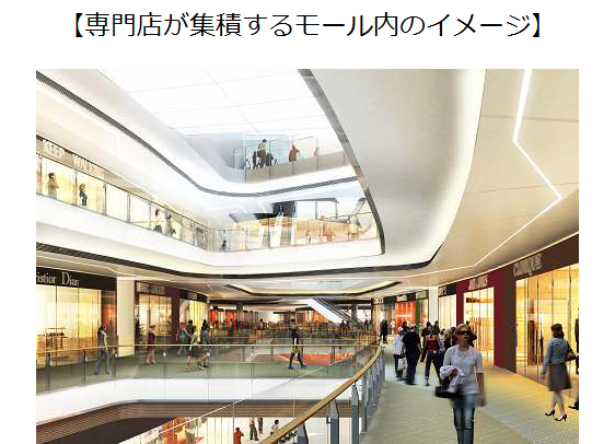 196店舗が集まる専門店には、「フォーエバー21」など愛知県初出店の36店舗のほか、「H&M」や「OLD NAVY」、新ブランドの「LE JUN」など感度の高いファッションブランドを多数導入する。「GU」も900㎡の店舗を展開する。また2階東側にはサブ核店舗として2600㎡の大型家電量販店「エディオン」のほか1000㎡の「無印良品」が出店し、総賃貸面積は7万5000㎡となる。イオンのフラッグシップモール「イオンモール幕張新都心」の総賃貸面積は4モール合わせて12万8000㎡で、核となるグランドモールの専門店数(オープン時)が237店舗。この名古屋茶屋のサイズは幕張新都心のグランドモールを思い浮かべるとわかりやすい。