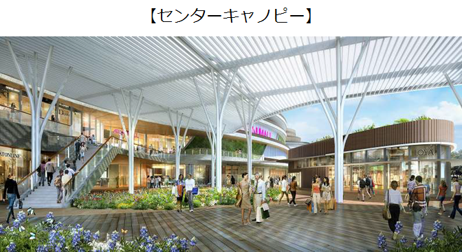 延床面積13万2000㎡・全長300m・4層のモールデザインは、国内外で実績があるアメリカの建築設計事務所「LLA(ラグアルダ・ロウ・アーキテクツ)」が手掛け、空や雲、風、花などの自然の要素を取り込んだ環境デザイン志向となっている。1階南側の「レストランガーデン」はテラス感覚の開放的な空間としたほか、3階中央のフードコートは吹き抜けによって2つ空間をつくりだす手法を導入するなどデザイン性の高い設計を施した。