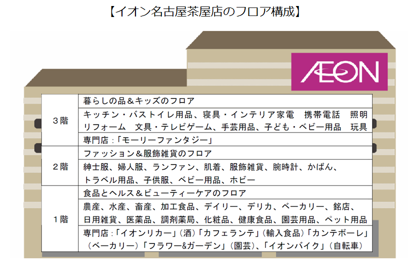 2010年3月にオープンした「イオン新瑞橋店」以来、愛知県内では4年ぶりの新店となる核店舗のイオン名古屋茶屋店は、やはり幕張新都心と同じ「イオンスタイルストア」となる。コンセプトは「なりたい明日のために、納得して買うことができる“幸せ”のご提供」で、コト・モノ・ネットのコンビネーションによるオムニチャネル化を進める。