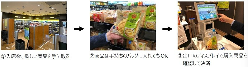 10時~15時の時間帯は有人店舗の店舗商品棚として、その他の時間帯は店舗一部区間を仕切り無人店舗として運営するハイブリッド店舗として活用する。無人決済システムの利用により、従業員が常駐しない時間帯でもお客が買い物ができるようになる。