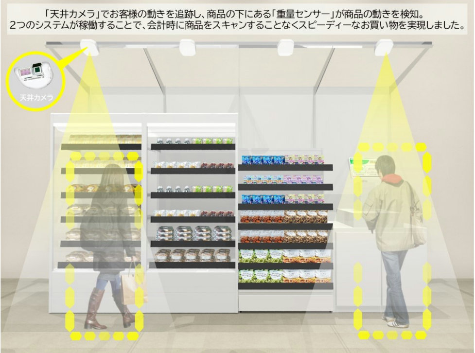 「TOUCH TO GO」の仕組みは、天井に設置されたカメラの情報から入店したお客と手に取った商品をリアルタイムに認識。出口付近に設置された決済端末のディスプレイに購入商品と合計金額が自動で表示され、ファミペイを含むバーコード決済、交通系電子マネー、クレジット、現金での支払いが可能。