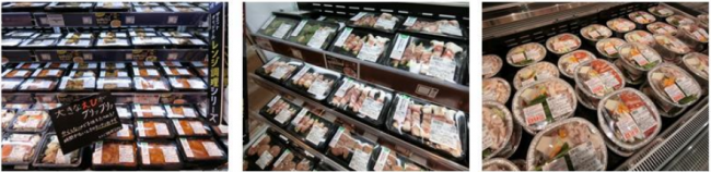 各売場には、調理の手間を省いた「簡便」「半調理」の商品を充実させる。生鮮素材を使用し、容器のままレンジ調理可能な「魚介総菜」や「肉巻き・肉詰め」、ガス・IH 調理器対応の「鍋セット」など、数多く販売する。