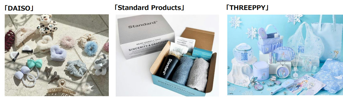 「DAISO」では、「ヘアアクセサリー」本体価格100~200円(以下同)や「コレクションケース」100~500円などの新商品を全国に先駆けて発売する。またビックカメラ新宿東口店限定で「ブラインドボックス(フィギュア)」100~700円の取り扱いも開始する。「Standard Products」では、「コーヒーミル」やステンレスの「ドリップポット」700円などを約20種まで新たに拡充する。「THREEPPY」では、初となるディズニー映画「アナと雪の女王」のデザインシリーズから、バッグやポーチ、ミラーなどの雑貨全38種類のうち25種を、300円~700円で先行販売する。