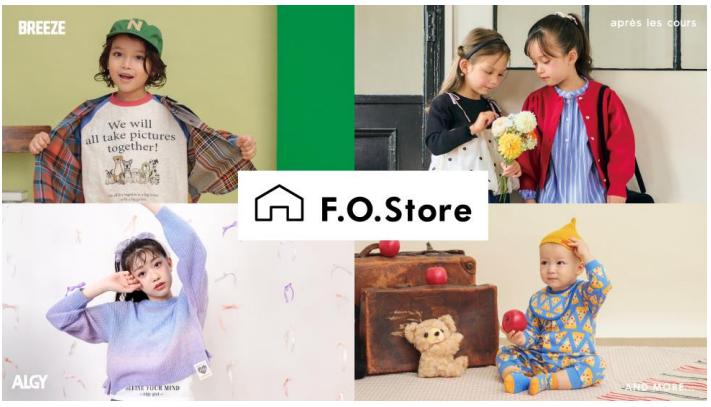 F.O.Storeはベビー、キッズ、ジュニアまでのアパレルと服飾雑貨や玩具、コスメをセレクトした新業態。F・O・インターナショナルが展開する複数のブランドから、子ども服「BREEZE(ブリーズ)」「après les cours(アプレ レ クール)」「ALGY(アルジー)」「p.premier(ピードットプルミエ)」を中心に品揃えする。