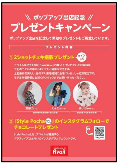 ポップアップストアでは、10月14日から販売を開始する「la farfa モデル 安藤うぃ×Derelikt(デアリクト)」、「la farfa モデル えんどぅー×SUREVE(シュリーブ)」、「あいちゃん×CHIP CLIP(チップクリップ)」の商品の一部を先行販売する。アベイルブースの商品の購入者には先着でノベルティをプレゼントする。ポップアップストアでターゲット層をマーケティングするのが狙いだ。