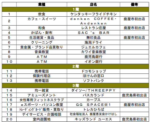 1階は、“食”“美”“健康”を提供するフロア。イオンの直営食品売場を核に、ケンタッキーフライドチキン、「danken COFFEE・Andenken」などの物販、飲食店などでこうせいされる。また大隅エリアへは初出店となる無印良品を1階に配置する。