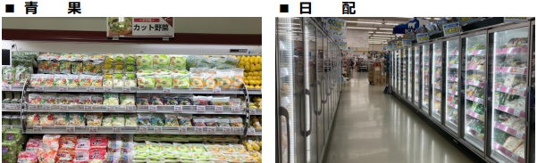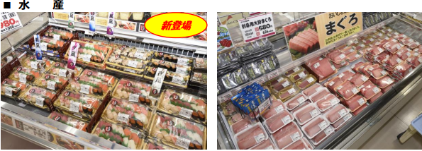 鮮魚は新鮮なネタを使用した生寿司コーナーを新設する。また、新鮮なまぐろなど、自慢の生鮮品の品揃えを充実させた。冷凍食品売場の便利でコスパのよい「ワンプレートミール」の品揃えを充実させる。リーチインケースは、ケース内で冷気を循環させるため、少ない消費電力で温度を一定に保つことが可能な省エネ対応。