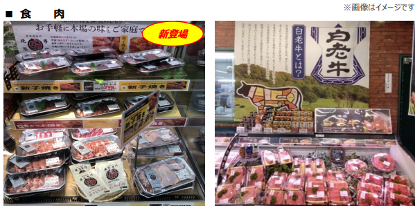 商品面では最も特徴を出したのが精肉売場。平和旭川本店の豚丼、韓国料理ソウル家のホルモン、やきとり専門ぎんねこの「新子焼き」「ちゃっぷ焼き」など地元の人気飲食店が監修した味付け肉を新たに品揃えする。また、白老牛をはじめとした各種ブランド肉を揃える。