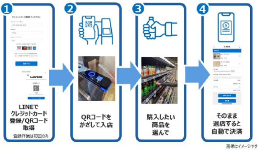 導入している仕組みは(株)NTTデータと店舗DXソリューションを手掛ける海外スタートアップ、Cloudpick(クラウドピック)が協働で開発したシステム「Catch&Go®」。Catch&Go®は、コミュニケーションアプリ(LINE)で取得したQRコードをかざして入店し、商品を手に持って店外に出ると、事前に設定したクレジットカード情報で、自動的に決済される仕組み。店内に設置したカメラでお客の動きを確認し、商品が置かれた棚の重量センサーと合わせることで、どの商品をいくつ手に取ったのかをAIが判別する。国内での利用率が90%を超えるLINE上で動作するシステムを新規に開発したことで、利用時に必須だった専用ネイティブアプリのインストールを不要にしている。