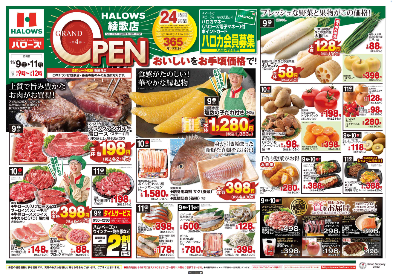 流通スーパーニュース > 店舗 > ハローズnews|香川県丸亀市に「ハローズ綾香店」11/2オープン ハローズnews|香川県丸亀市に「ハローズ綾香店」11/2オープン 店舗 / 2024年11月11日 ツイート (株)ハローズ(広島県福山市、佐藤利行社長)は11月2日(土)、香川県丸亀市に「ハローズ綾香店」をオープンした。 地元丸亀市の老舗店舗「プリティショップはなこ」跡地に「ハローズ綾歌モール」を新設。その核店舗だ。 ■ハローズ綾香店 所在地/香川県丸亀市綾歌町岡田下294番地1 営業時間/24時間営業 休業日/年中無休 ツイート