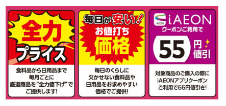 サービス面では、毎日使う商品をいつでも納得できる価格で提供する、「全力プライス」「毎日が安い!お値打ち価格」「iAEON55円値引」の3つのお得として提供する。
