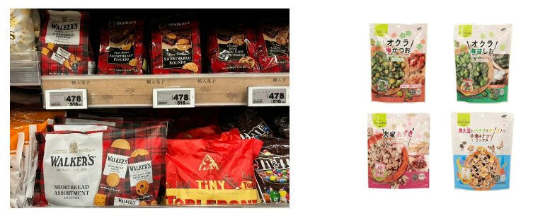 食品売場では、スコットランド発のお菓子メーカー「Walkers」のショートブレッドやビスケット各種を、野菜のうま味を活かしたヘルシースナックを展開する「ASHITAMO」の商品各種を取りそろえる。