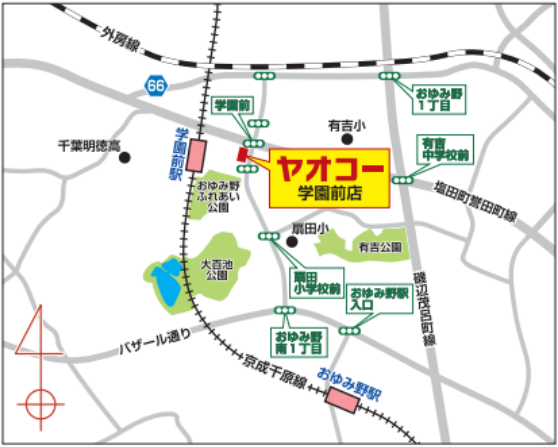 同店は、京成電鉄千原線「学園前駅」東口から約450m、徒歩約6分の距離に位置する。店舗北側は塩田町誉田町線に面していて、車でもアクセスしやすい。「学園前駅」西側には、千葉明徳学園の短期大学・高校・中学校・幼稚園が、駅周辺には大きな公園がいくつもあるエリアとなっている。