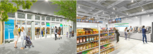 「ファミリーマート大阪・関西万博店」は、会場内「ウォータープラザマーケットプレイス東」に位置する。店内には、ファミリーマートでは初となる、横幅7mを超える大型デジタルサイネージを設置し、立体的に見える3D映像を活用した高画質コンテンツを上映する。内装には、再生素材を利用した商品棚やレジカウンターを用い、海洋プラスチックごみを原材料の一部に利用した買物かごを設置するなど、持続可能な開発目標(SDGs)達成への貢献を目指す店舗を運営する。