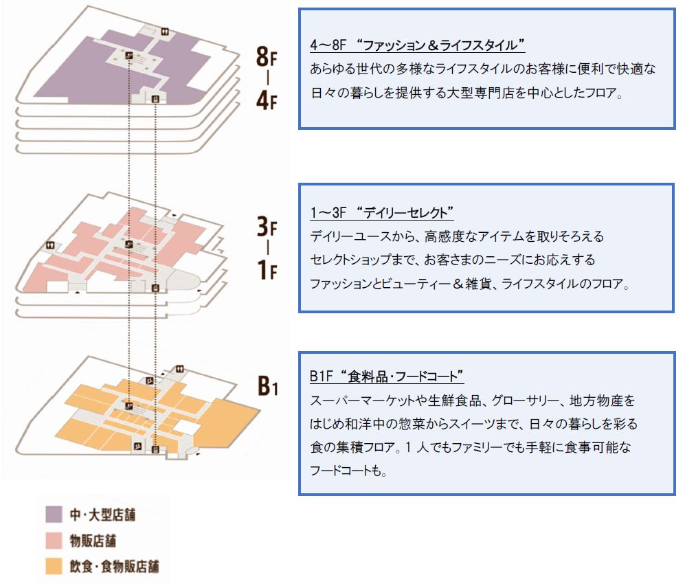 地下1階は食料品とフードコート、1~3階はデイリーセレクトとして、ファッションとビューティ&雑貨、ライフスタイルのフロア。そして4~8階はファッション&ライフスタ売りのフロアで大型専門店を中心に構成する。