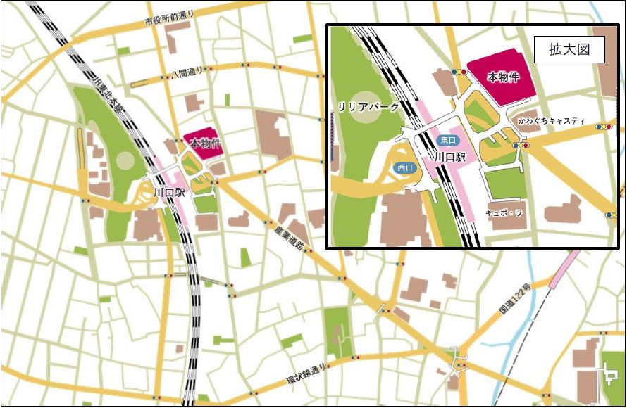 施設は、JR京浜東北線「川口」駅東口からペデストリアンデッキで接続された駅至近の交通利便性のよい場所に立地する。