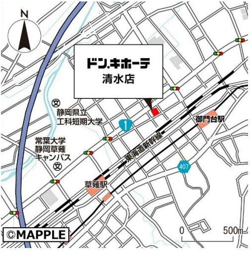 「ドン・キホーテ清水店」は国道1号線沿いに位置し、地域住民が日常使いしやすい商品構成の店舗となる。新東名高速道路サービスエリア内に出店中のドライブユーザー向け特化型店舗「ミチドンキ NEOPASA 清水店」とともに、清水区の人々に愛される店舗を目指す。