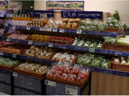 改装後は、地場野菜や地域の銘産品などを集めた「じもの」コーナーを充実させ、地域の生産者からの新鮮な野菜や果物を展開する。また地元漁港からの新鮮な魚、県内で育った安全・安心な豚肉、地元工場で生産された加工品など、地元商品を多数品揃えする。