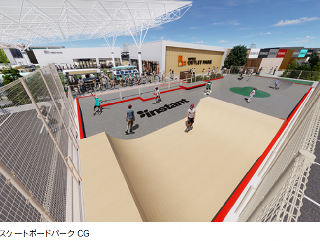 第2に、約700㎡の大屋根広場「ルーフテラス」や日本初アウトレット常設のスケートボードパークを新設。スポーツ・エンターテインメント・食などの各種イベントが実施できるだけでなく、雨天時にもレストスペースとして利用できる。その他共用部の環境演出により、この施設でしか体験できない価値を提供する。