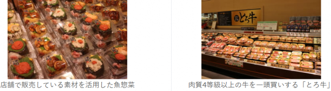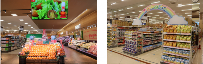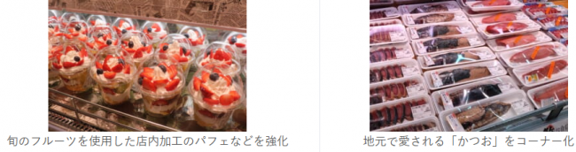 売場は、青果コーナーでは、旬の果物を中心に彩り豊かなプレゼンテーションで顧客にアピール。また、店内手作りのパフェやカットフルーツなど出来たてを提供する。鮮魚コーナーでは、浜松市場から新鮮な魚介類を調達する。「かつお」はサク・お造り・たたきなどバラエティ豊かに展開するほか、厳選して仕入れた素材を活用した魚惣菜を強化し、素材と惣菜の両軸で展開する。