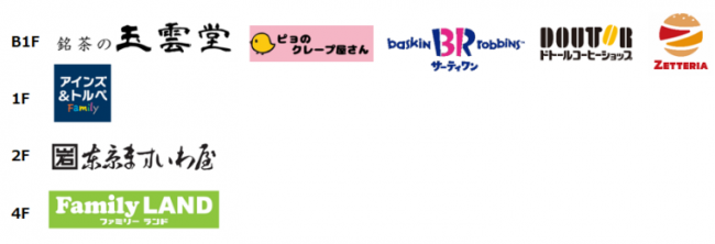テナントでは、銘茶の玉雲堂(食品物販)やアインズ&トルぺ Family(化粧品・医薬品・日用品)、ドトール、ゼッテリアなどの地域に密着した物販やフードサービス、アミューズメントが順次オープンする。