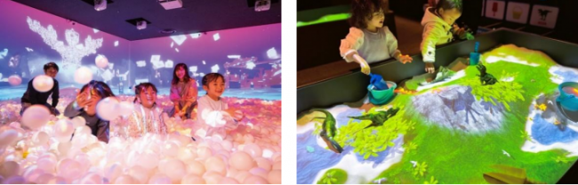 砂遊びやぬりえといった“昔からある遊び”にプロジェクションマッピングや AR(拡張現実)などのテクノロジーを融合させたアトラクションを通じて、“遊びが学びに変わる”体験を提供する。