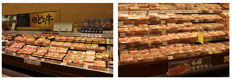 精肉コーナーでは、ベイシアブランド牛肉の「とろ牛」から、「和豚もちぶた」「燦々鶏」など品質の良い国産肉をコーナー化し、求めやすい価格で提供する。