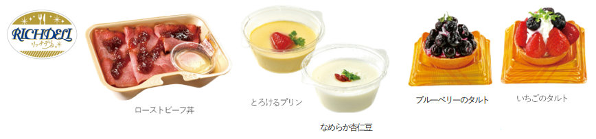 新たに展開する「RICHDELI」では、ジューシーなローストビーフを使用した丼やおつまみ、またプリン、杏仁豆腐、彩り鮮やかなフルーツタルトなど自慢の店内手作りスイーツを取り揃える。
